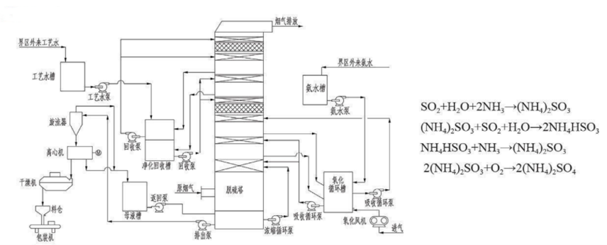 煤、石油中含有一定含量的硫,高溫燃燒后產生硫氧化物(SO2和SO3),對大氣環境造成嚴重污染,氨法脫硫技術以 NH3和SO2反應為基礎,在多功能煙氣脫硫吸收塔中,利用氨基吸收劑吸收煙氣中的SO2生成亞硫酸(氫)銨,并在富氧條件下將亞硫酸(氫)銨氧化成硫酸銨,再利用熱源(煙氣、蒸汽熱量)將(NH4) 2S04溶液濃縮、過飽和結晶析出固體,過濾干燥后得到脫硫副產品。