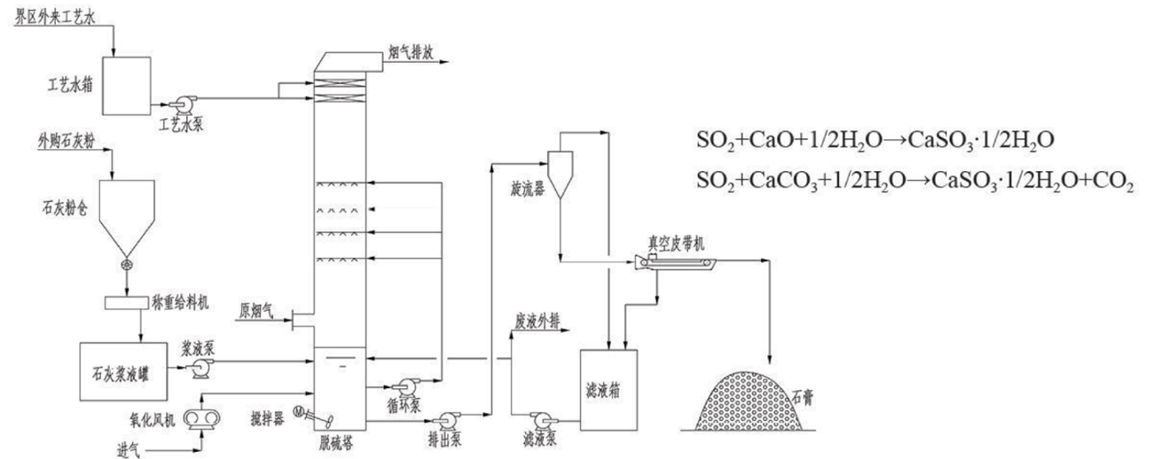 環(huán)石灰石/石灰-石膏濕法煙氣脫硫工藝采用廉價易得的石灰石或石灰作為脫硫吸收劑,石灰石經(jīng)破碎磨細(xì)成粉狀與水混合攪拌成漿液。當(dāng)采用石灰作為吸收劑時,石灰粉經(jīng)消化處理后加水?dāng)嚢柚瞥晌諠{液。在吸收塔內(nèi),吸收漿液與煙氣接觸混合,煙氣中的二氧化硫與漿液中的碳酸鈣以及鼓入的氧化空氣進(jìn)行化學(xué)反應(yīng),最終反應(yīng)產(chǎn)物為石膏。同時去除煙氣中部分其他污染物,如粉塵、HCl、HF、SO3。脫硫后的煙氣經(jīng)除霧器除去帶出的細(xì)小液滴,經(jīng)熱交換器加熱升溫后排入煙囪。脫硫石膏漿液經(jīng)脫水裝置脫水后回收。該技術(shù)采用單循環(huán)噴霧空塔結(jié)構(gòu),具有技術(shù)成熟、應(yīng)用范圍廣、脫硫效率高、運(yùn)行可靠性高、可利用率高、工程造價低的特點。