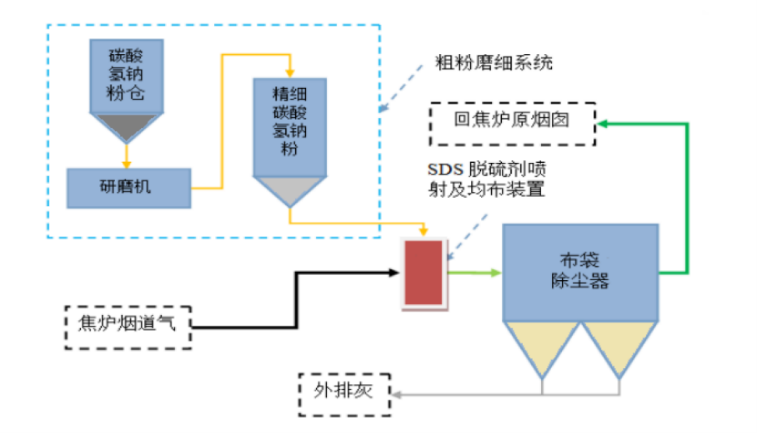 利用碳酸氫鈉(粒徑為20-25μm)做為脫硫劑,通過噴射系統將NaHCO3均勻噴入煙氣管道中與270-290℃煙道氣進行混合反應,鈉基粉體在高溫廢氣中激活熱分解,與廢氣中的SO2充分接觸,發生物理、化學反應,煙氣中的SO2等酸性物質被吸收凈化,在反應器、煙道及布袋除塵器內,脫硫劑超細粉一直與煙氣中的SO2發生反應。可生產副產物Na2SO4。通過布袋除塵器回收脫硫副產物。