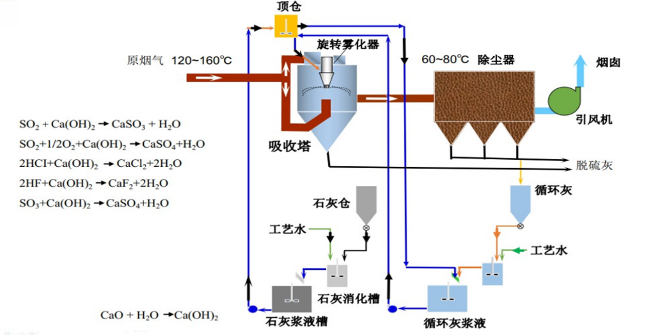 利用噴霧干燥原理,在吸收劑噴入吸收塔后,一方面吸收劑與煙氣中的SO 2 發生化學反應,石灰漿液在其中霧化,與煙氣中的SO2反應脫硫,另一方面煙氣將熱量傳遞遞給吸收劑,使之不斷干燥,在塔內脫硫反應后形成的產物為干粉,液滴被干燥生成能自由流動的粉末(亞硫酸鈣、硫酸鈣及飛灰);其部分在塔內分離,由錐體出口排出,另一部分隨脫硫后煙氣進入電除塵器收集。